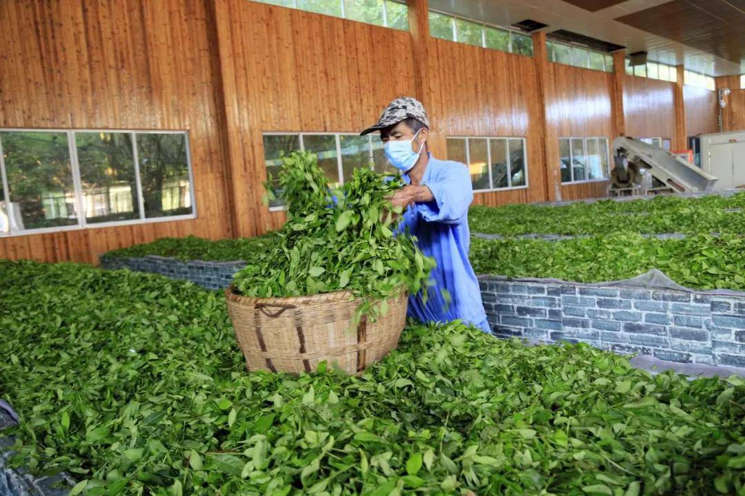 图为近日,贵州省凤冈县洪成金银花茶业有限公司生产车间,工人在摊凉红茶原料。