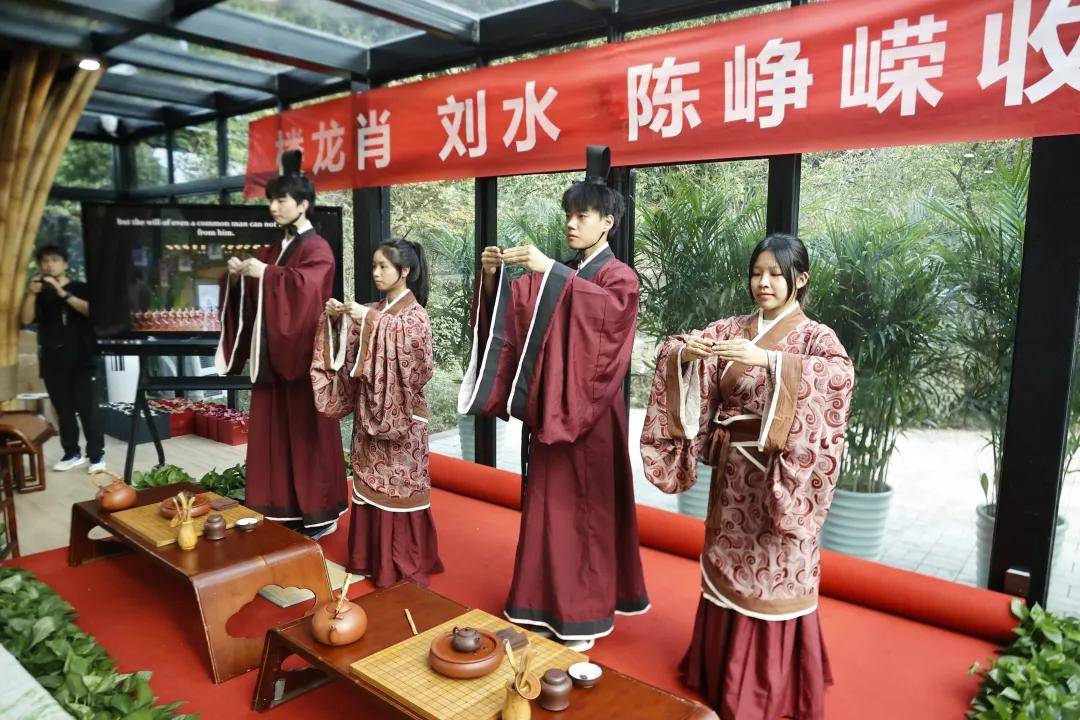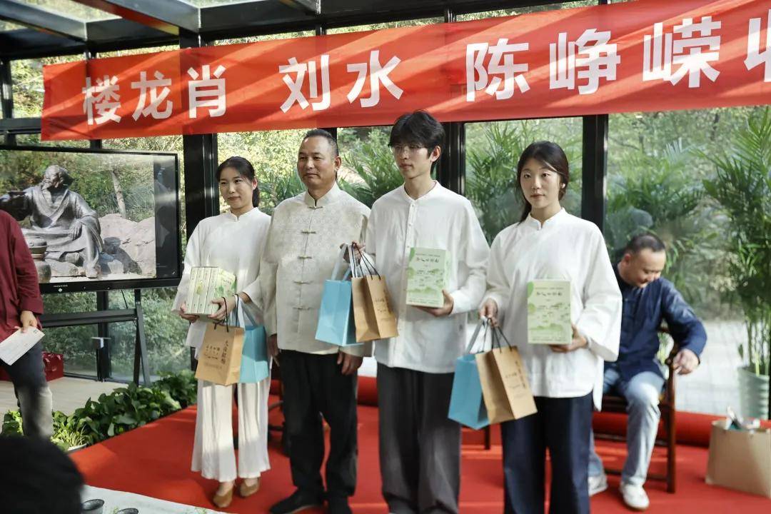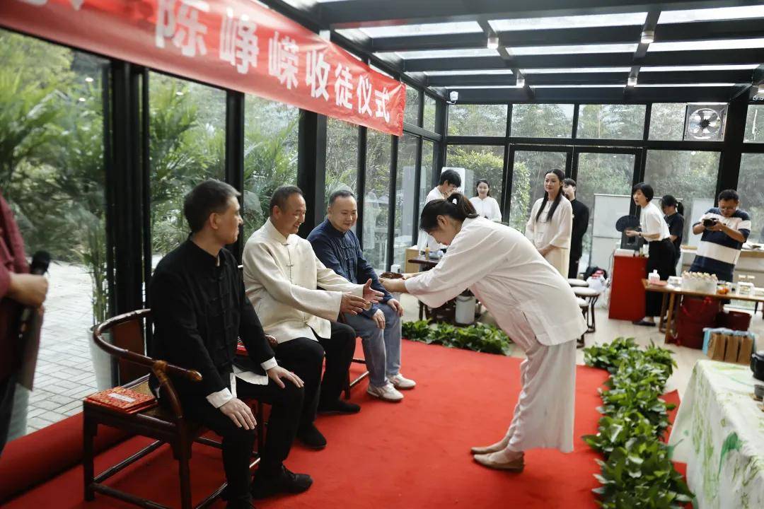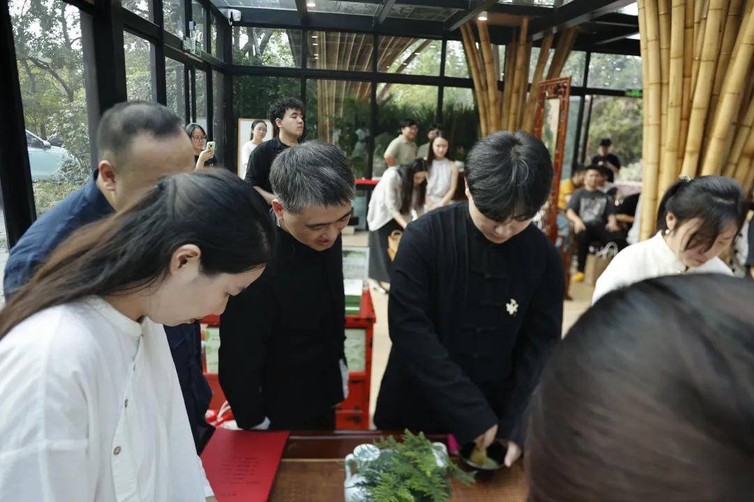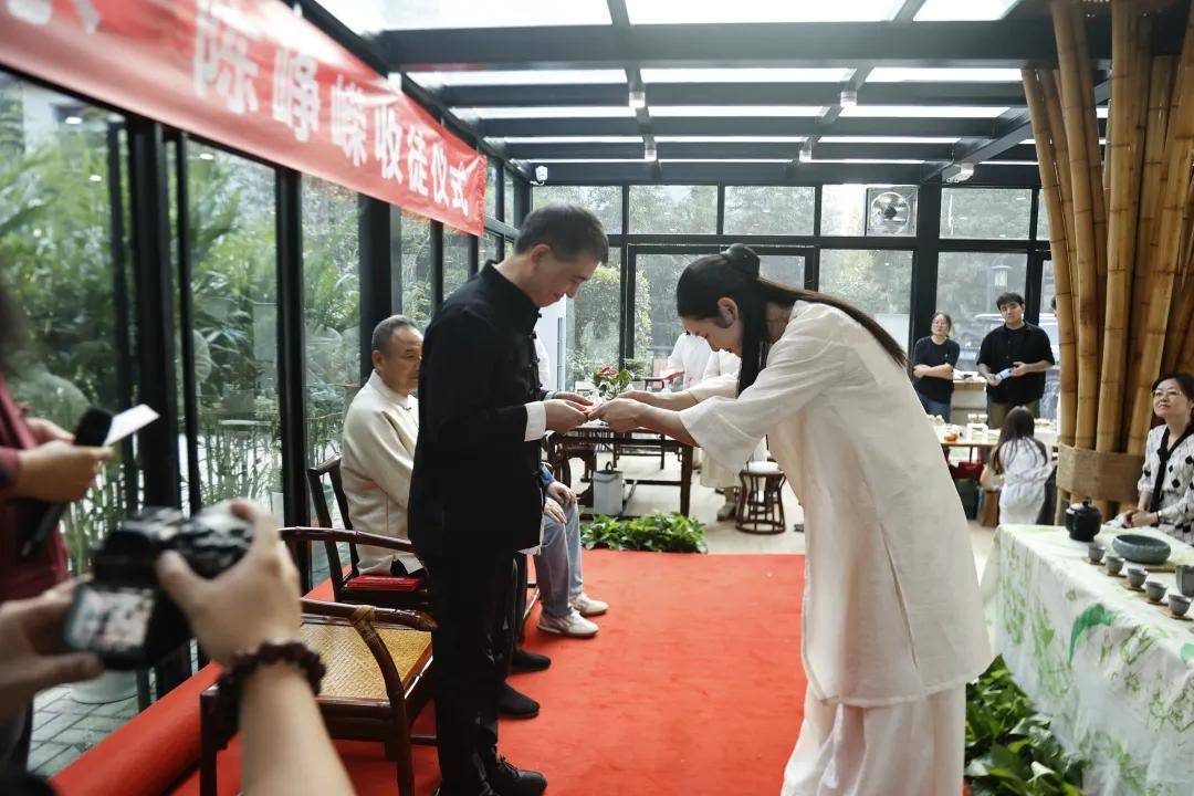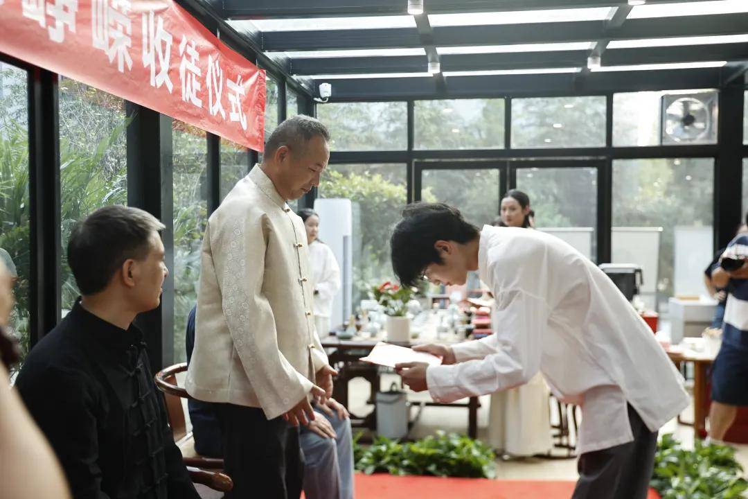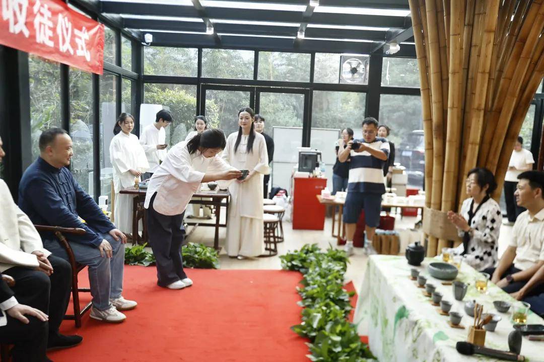 浙江农林大学非遗研究院名誉院长、茅盾文学奖得主王旭烽;以匠心妙手守护非遗瑰宝,西湖龙井采摘与炒制技艺国家级代表性传承人樊生华;浙江农林大学茶学与茶文化学院党总支书记张路;浙江花园集团党委书记邵君芳;青山湖科技城投资集团总书记陈向阳等嘉宾参加本次仪式组成见证人团,共同见证九曲红梅茶制作技艺代表性传承人楼龙肖、柘荣高山白茶制作技艺代表性传承人刘水,桂花龙井茶制作技艺代表性传承人陈峥嵘的收徒仪式。三位大师和七位弟子,将以一系列具有象征性的茶仪式,弟子将在点茶的盏面上写下自己名字,作为信物奉献给师父,以显示来完成拜师的寓意和诚信,表达“一日为师终身在席”的契约感,而师父将同样赐予师门寄语规则,承诺通过“一对一”“一对多”的师承模式,把核心非遗技艺倾囊相授。活动汇聚众多业界精英与文化传承者,其中多位大师正是此次收徒的“师父代表”,茶学专家学者、临安本地茶企代表及茶文化爱好者共襄盛举,政企学研多方联动,为师徒传承与产业对接搭建桥梁。